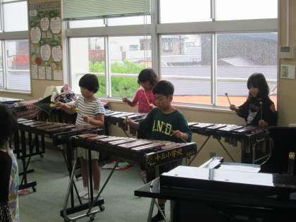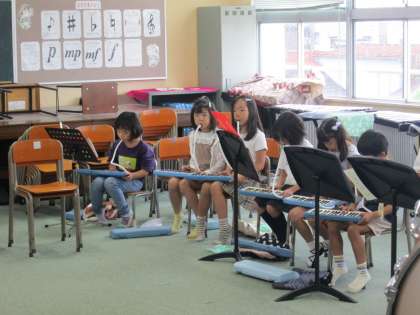 1学期の音楽の学習の成果として、「♪子犬のマーチ」の器楽合奏と、「♪えがおの花が さくように」の合唱を披露してくれました。観客の先生たちから拍手と共にアンコールの声がわきあがり、予定にはなかったんですが、2年生のお気に入りの「♪ドレミの歌」も歌ってくれました。