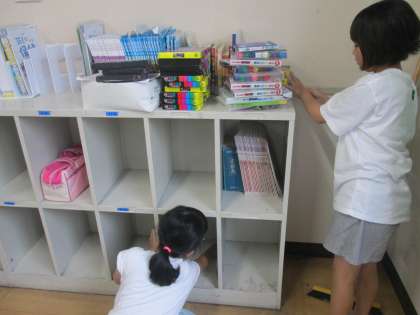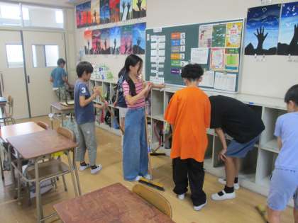4ヶ月過ごした教室は、ふだん掃除をしていてもやっぱり汚れが溜まってしまいます。1学期のおわりの日にはみんなで大掃除をして、教室をすみずみまでピカピカにします。