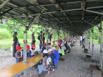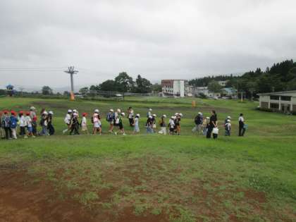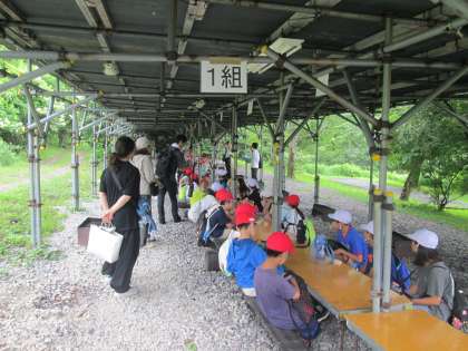 集合写真のあと少し雨がぱらついてきたので、高原から移動し、飯盒炊爨の場所でお昼ごはんをいただきました。