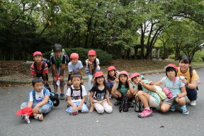 服部緑地公園では、なかよし班ごとに時間差を設けて出発し、各ポイントで先生たちが出す「お題」を班のみんなと協力して解決します。遊具のところで遊びに夢中になるあまり班のみんなとはぐれてしまうといったアクシデントもありましたが、何とか無事に終えることができました。