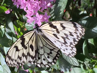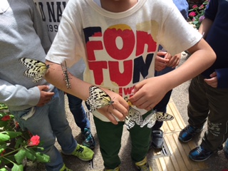 また、帰りには昆虫館に寄りました。ちょうちょがふわふわ舞っている温室に入ると、子ども達は、なんとか自分の体に止まってくれないかと悪戦苦闘していました。運よく止まった子は、とてもうれしそうにしていました。