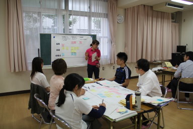 その後の研究討議会では、ワークショップ型の討議会を行い、気付いたことをふせんに書きました。「成果(ピンク)」「課題(黄)」「改善策(青)」を、研究の視点別にまとめ、職員で意見交流を行いました。 最後には、大阪市教育センターの三軒先生からご指導いただき、今後の研究についてお話いただきました。