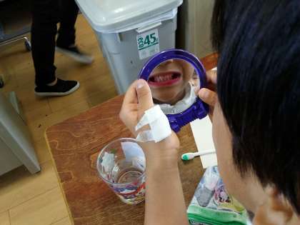磨き残しの場所がはっきりとわかりました。歯と歯の隙間や、歯ぐきとの間が多かったです。子ども達は自分の歯の磨き方を考え、きれいに歯磨きしようと心がけました。