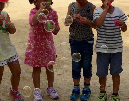 子どもたちは、シャボン玉づくりの名人です。