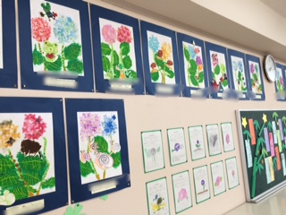 土曜参観の日に取り組んでいたあじさいの花がやっと仕上がりました。花のそばには、子どもたちオリジナルのかわいいカタツムリやアマガエルも添えてみました。学校にお越しの際は、教室ものぞいてみてくださいね。