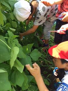 春に種をまいた三度豆を収穫しました。葉っぱは大きく青々として、どこに実があるのか探すのに一苦労でした。紫のかわいい花が、まだ咲いているのでこれからも実をつけることでしょう。