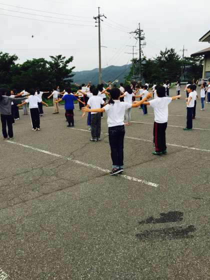ちょっぴり寝不足な子もいるようですが、元気よくラジオ体操をしています!