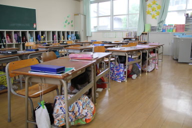 緊急地震速報が流れたあと、教室にいる子ども達は、いそいで机の下に隠れました。1年生の子ども達は、初めてでしたが、とてもすばやく行動していました。