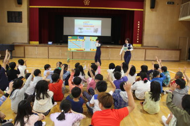 先日、淀川警察、セーフティー淀川の方にお越しいただき、交通安全指導を行いました。1,2,3年と、4,5,6年で分かれて、お話していただきました。子ども達からは、