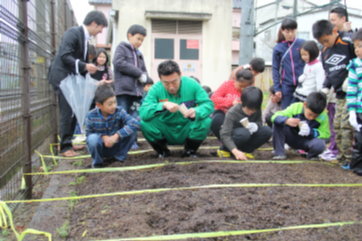 3月20日(木)、株式会社マイファーム代表取締役 西辻一真さんにお越しいただき、3年生がにんじんの種とじゃがいもの種いもを植えました。