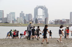 地域の方々や保護者の方がに見守られ、子どもたちはウナギの稚魚を見つけたり、エビを捕まえたり、「クラゲ?」を見つけたりして「十三干潟」を思う存分楽しんでいました。