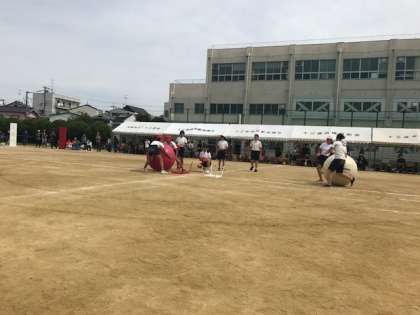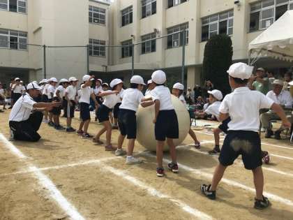 (上)低学年は転がし、高学年は頭の上に持ち上げて運びます。