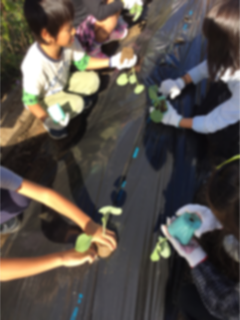 1年は、白菜とブロッコリーを育てます。ブロッコリーを植える話をすると、「きらいやったけど、すきになった。」という声も聞こえてきました。野菜を育てることで、野菜に親しみ、好き嫌いなく食べられるようになればよいなと思います。