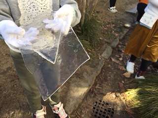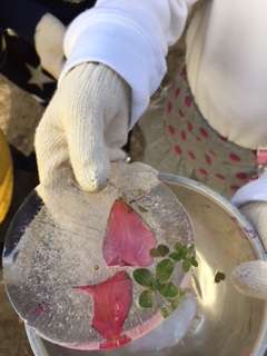 1月11日(木)天気予報では、翌日、最低気温が氷点下になるということでしたので、水が凍るか試してみました。容器に、花や葉っぱなど好きなものを入れて、どこに置いたら凍りそうか考えて一晩置きました。金曜日の朝、登校すると、玄関の池が凍っていました。わくわくしながら仕掛けた容器を見に行くと、見事に凍っていました。でも、凍らなかった子が2人だけいました。そこで、何が違うのかを考え、風があたる方が冷えて凍るということに気づきました。