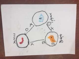 一つ紹介します。「とりかご」は「すずめ」に勝ちます。すずめを閉じ込めることができるからです。「すずめ」は「ミミズ」に勝ちます。ミミズを食べるからです。「ミミズ」は「とりかご」に勝ちます。通り抜けることができるからです。(写真上)