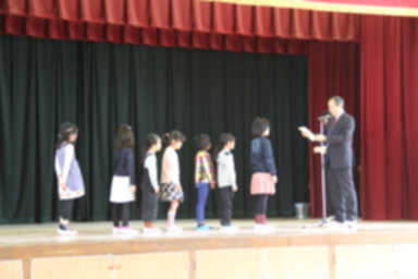 その後、読書名人、暗唱名人、なわとび名人の表彰を行いました。読書は、低学年が1年間で80冊、高学年が50冊。暗唱は、20個の暗唱詩文を覚える。なわとびは、低・中・高学年のなわとびがんばりカードに応じて、名人を表彰しました。