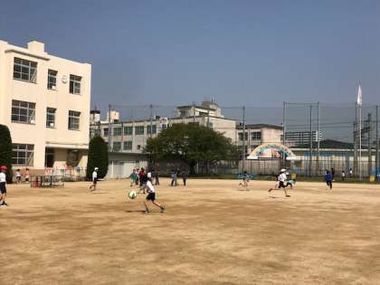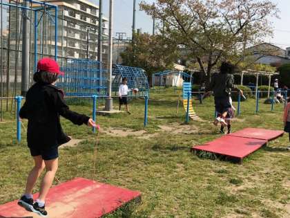 さわやかな春のそよ風がただよっている校庭で、バスケットボールを楽しんだり、バレーボールをしたり、縄跳びの練習をしたりと、子どもたちがめいめいに遊んでいます。春休み会えなかった友だちと、新しい学年でまた一緒に学校生活を送る喜びが感じられます。