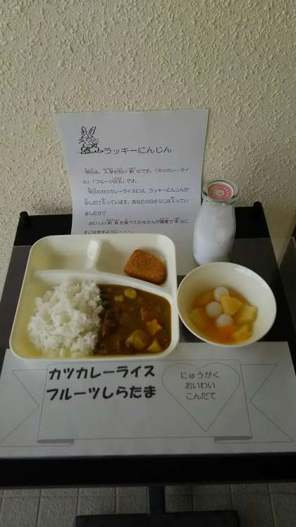 今日は入学お祝い献立で「カツカレーライス」「フルーツ白玉」「牛乳」でした。