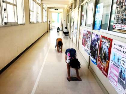 3年生が職員室前の廊下をきれいにそうじしています。ていねいにぞうきんもかけてくれたので、ぴかぴかになりました。きれいになったことがうれしくて、校長室の床まで、ぞうきんで拭いてくれた人もいました。