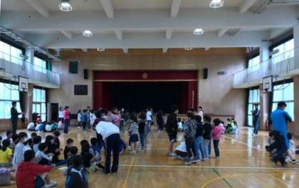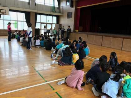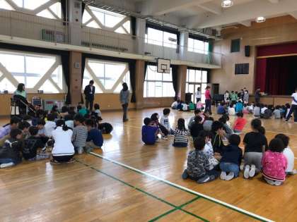 今年度のなかよし班結成後初めての児童集会でした。今日のゲームは、録音された声を聴いてどの先生かをあてるというもので、班ごとにじっと聞き入っていました。とても難しく、4人の先生の声のうち1人あてた班が半分だけという結果でした。