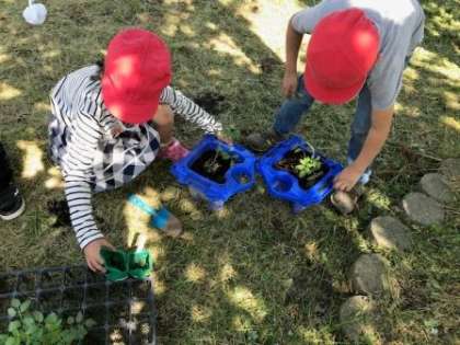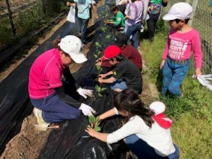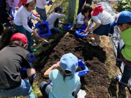 久しぶりに青空が広がった今日、2年生がミニトマトの苗と、なすびの苗を植えました。都会の生活で土に触れることはほぼありませんが、子どもたちは植木鉢に入れた土を手でぎゅうぎゅう押したり、水平にならしたりと、ふかふかの腐葉土の手触りを楽しんでいました。