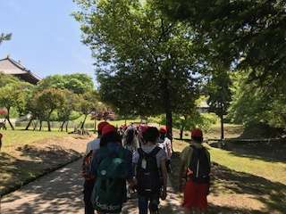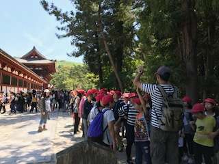 全員元気に歩いて、東大寺に到着しました。お天気がよく、観光客や、遠足の小学生で大盛況です。