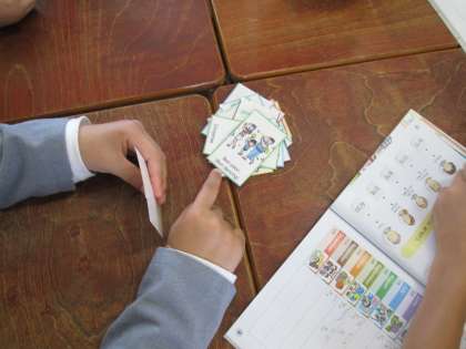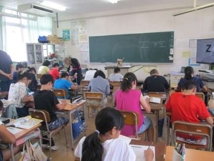 6年生は現在、1〜12月のことをそれぞれ英語で何というか学習しています。今日は総集編ということで、手作りのUNOカードを使って、カードに描いてある行事が何月にあるかカードを出すときに英語で言うゲームをしました。(写真のカードはBon-odoriです。)時間が経つにつれどんどん盛り上がって、January,February,March,April,May...とすらすら出てくるようになりました。シメにアルファベットの書き方も練習しました。こちらは今日でアルファベット26文字をコンプリートしました。