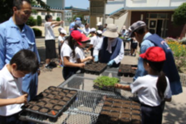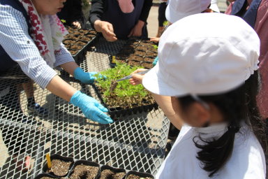 夢ちゃん花づくり隊の方と一緒に、3年生の子ども達がマリーゴールドの「おひっこし」をしました。4月末に植えた種が芽を出し、少し大きくなってきたので、中ぐらいのポットに移動させました。