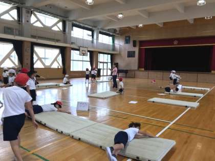2年生が3時間目の体育の時間に体育館でマット運動をしました。前回り、後ろ回り、身体を伸ばして丸太転がり、大きな前回りなど、サーキットトレーニング風にチャレンジしていきました。むかし家の布団の上で練習したなあと自分の子どものころを思い出しましたが、そういえば今の子どもたちはベッド派が多いようですから、おうちではなかなか経験できないのかも知れません。それでもみんな、勇気を出して回転技に挑んでいました。