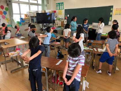 1年生にとっては初めてのストレッチです。健康委員会のみなさんが、教室に行って一緒にしてみました。お兄さんお姉さんの真似をして、一生懸命にしていました。かっこいい姿勢を目指して、これからは毎日できますね。