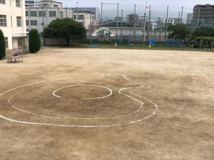朝登校したら、なんと校庭にミステリーサークルが出現!?実はこれは、集会委員さんたちが今朝の集会、「島渡りおにごっこ」の準備のために昨日の放課後描いてくれたものです。