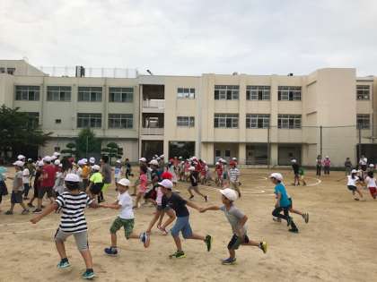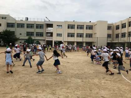 なかよし班でペアを作り、仲良く手をつないで、オニにつかまらないよう島から島へ走って渡りました。