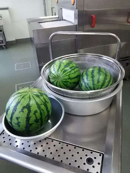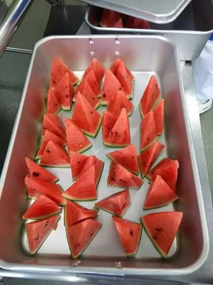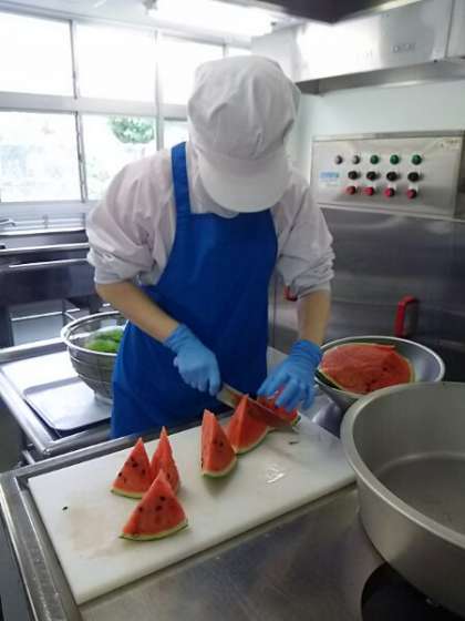 今日の給食は「かぼちゃのミートグラタン、スープ、すいか、食パン、いちごジャム」でした。すいかは年に一度の登場です。今年も鳥取産のすいかでした。給食室で給食調理員さんが1玉を64人分に見事に切り分けます。