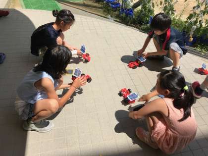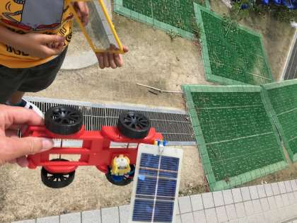 真夏の日差しの中、4年生がソーラーカーを組み立てて走らせる実験第1回目を行いました。プラスティック製の歯車に成型時のバリが残っていたり、銅線をまいて作った接触部分が電流を通しづらかったりと、なかなか走ってくれませんでした。ソーラーカーを手で持って、日に当てるとタイヤは回るよと、見せてくれた子もいました。未来のエンジニア、出現!!!次の授業では、走るように工夫をしていきます。