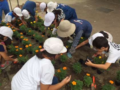 苗が入るくらいの穴を掘る→苗の入っているポットをさかさまにして、やさしくポットから苗を取る。→花壇に植え、上から土をかける です。