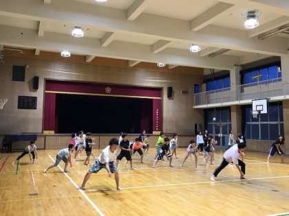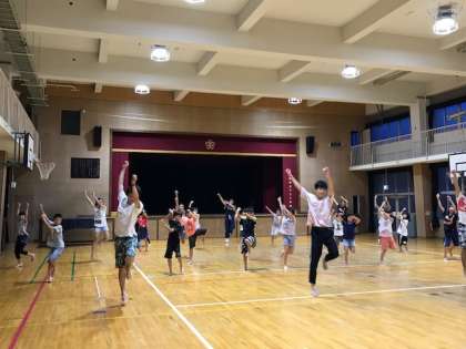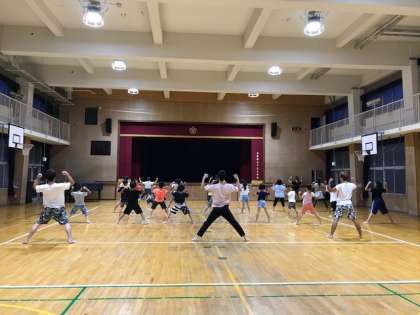 日も暮れ始める頃、体育館から子どもたちの元気な声が響いてきました。のぞいてみると、ダンスサークル「まかな」の方たちと、十三小学校の子どもたちがかっこいいダンスを練習していました。本番ではハッピを振って踊るそうです。歌もかっこよくて、歌いながら踊っている人も大勢いました。