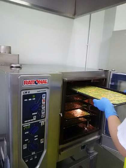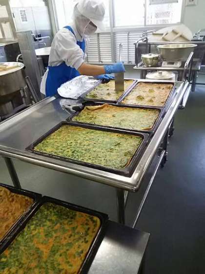 今日は「豚肉と野菜の煮もの、チヂミ、もやしの甘酢あえ、大型コッペパン、りんごジャム」です。チヂミは韓国・朝鮮料理です。給食室の焼き物機で焼いて、一人分に切り分けています。