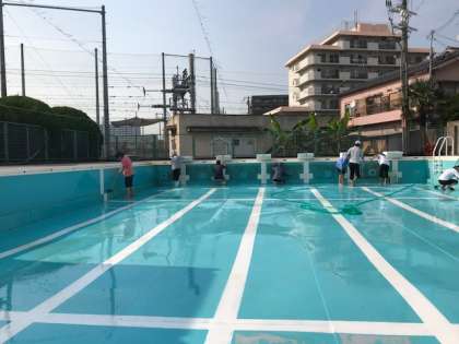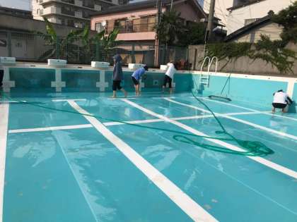 今日は2週間に1度のプール水交換と清掃の日でした。猛暑の中、教職員で力を合わせてプールの壁や床を磨きました。