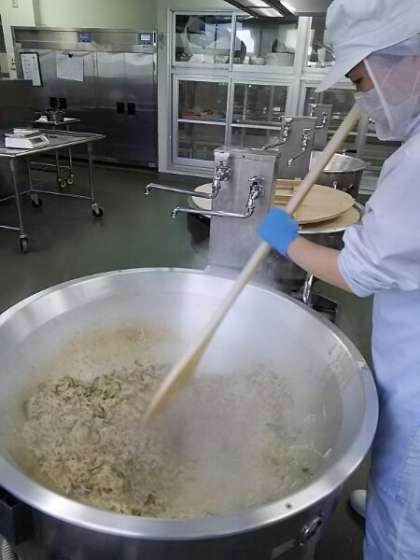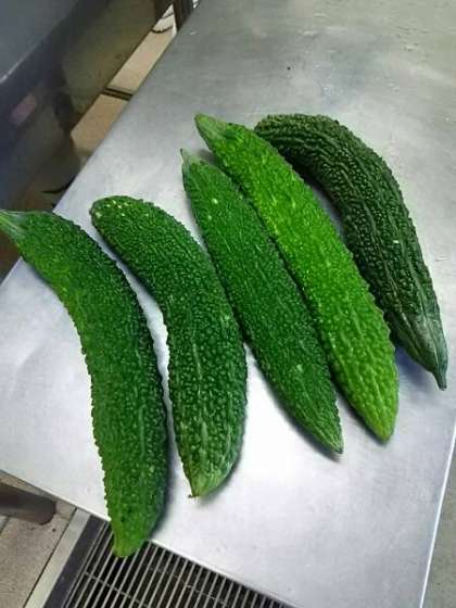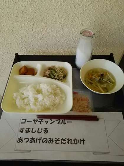今日の給食は「ゴーヤチャンプルー、すまし汁、あつあげのみそだれかけ、ご飯、牛乳」でした。ゴーヤチャンプルーに使うゴーヤ(にがうりともいいます)に含まれる苦味成分は、食欲を増す働きがあります。また、熱に強いビタミンCをたくさん含んでいます。一年生は「苦い〜」「おいしい〜」とゴーヤチャンプルーを食べていました。