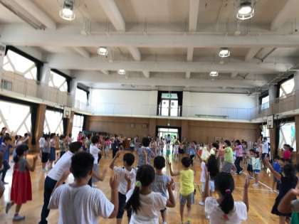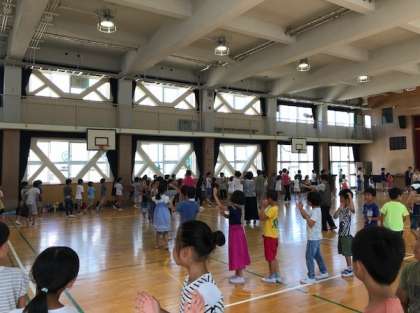 7月28日は、十三連合盆踊り大会が行われます。そこで、一人でも多くの子どもたちに、盆踊りの楽しさを知って、当日踊りの輪に入ってもらおうと、盆踊りの練習を行いました。今日ははぐくみネットさんのお世話で、田川女性会民謡部の方々にお越しいただき、炭坑節と淀川音頭の2曲を練習しました。体育館はとても暑かったですが、こどもたちは元気で、「ええとこでっせ」と曲に合わせて大きな声で元気に掛け声をかけていました。踊りの方もすぐにコツを覚えることができました。28日、楽しみですね。