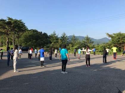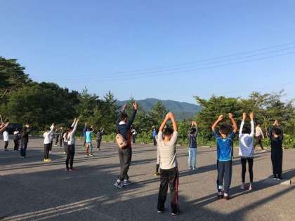 涼しい朝です。下には雲海が広がっています。昨夜は、9時半就寝でよく眠れた人がほとんどでした。