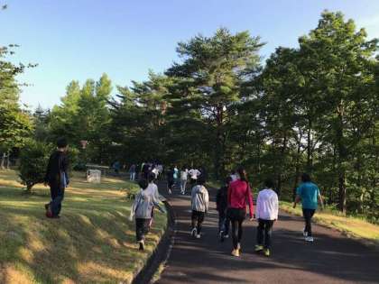 ラジオ体操を終えて、キャンプ場を散歩しています。日陰はひんやりして、いい気持ちです。これで、朝ごはんをモリモリ食べられそうです。