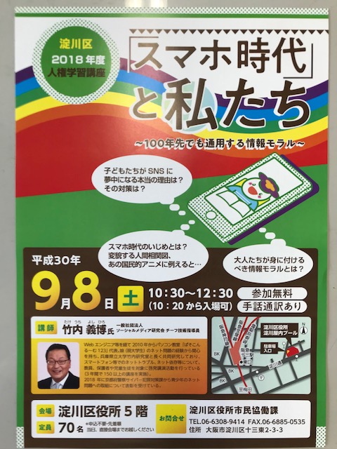 来る9月8日土曜日10時30分より12時30分まで、淀川区役所5階において、「『スマホ時代』と私たち」をテーマに、講演があります。便利なスマホですが、子どもたちが事件に巻き込まれたり、いじめの道具になったりと、親として心配になることはたくさんあります。講師の方は京都府警より表彰を受けるなど、青少年とスマホ・インターネットに関するわかりやすい講演を多数行っておられます。