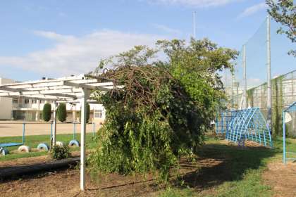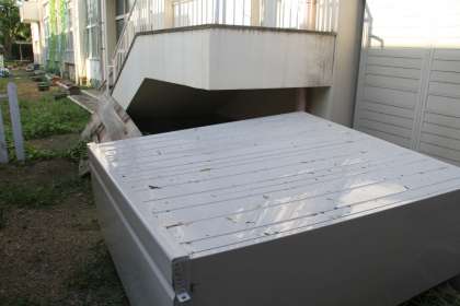 校内の被害としましては、写真のように藤棚のフジがまくれあがったり、PTAの物置が倒れたり、いきいき活動室の窓ガラスが1枚割れたり、その他桜などの枝が折れるなどありましたが、子どもたちは安全に活動できています。給食も無事、十三中学への配達を終え、今は小学生たちが「いただきます」をするところです。