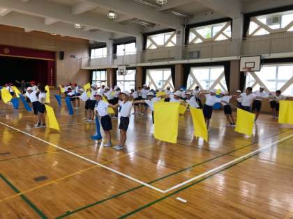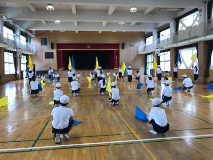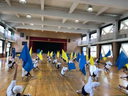 今年も6年生と5年生が、フラッグ(旗)を使った団体演技を披露します。バシッ、バシッという迫力ある音、一緒に林間学習をして心を通わせた集団だからこそできる動き、きっと大きな感動の渦を巻き起こしてくれることでしょう。