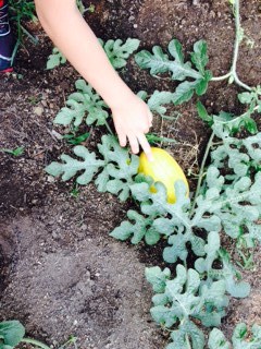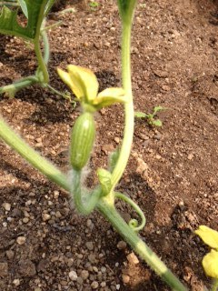 雌花に雄花の花粉をつけて、人工的に受粉しました。小さなスイカの実が5,6個できています。みんなで食べられるほど大きく育ってほしいです。