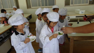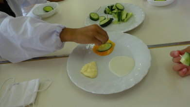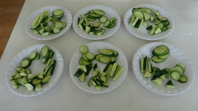 きのうみんなで収穫したキュウリを、今日はみんなで試食しました。食べ方は子どもたちと相談し、サラダで食べることになっていました。しっかり洗ったキュウリは、念のため熱湯をくぐらせてから切ります。ドレッシングやマヨネーズ、調味酢などいろんな味付けで食べくらべをしてみました。子どもたちに「どの味付けがおいしかった?」とたずねてみると、意外と醤油や塩と答える子どもが多かったです。「キュウリが前より好きになったよ」「おとうさんにも食べさせてあげたかったわ」と、うれしい感想が聞こえてきました。