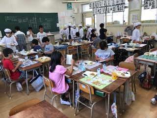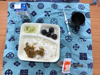 4年生の教室をのぞいたら、てきぱきと給食の配膳をしていました。今日の献立は、大豆入りキーマカレー、キャベツときゅうりのサラダwithマヨネーズ、そしてデザートに巨峰でした。当番の子どもたちは給食着を来て、盛り付けと配膳中、当番でない子どもたちは、自席で本を読んだり、先生に質問をしたりしています。