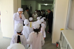 本校の給食室は水の使用を最小限に抑えた衛生的な「ドライシステム」を採用しており、その実情を見学しに来られました。子ども達の給食の様子を見学したり、実際に給食を食べたりされました。