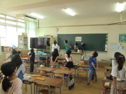 5時間目の開始前に2年生の教室に行ってみると、係の子どもたちが指示をして、みんなで姿勢体操をしていました。肩の筋肉や背筋をのばして、すっきりしてから5時間目をスタートします。脳への血流も増えて、頭もさえることでしょう。